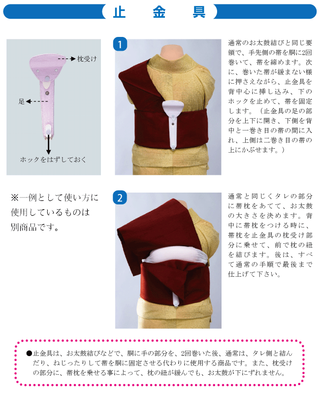 どんな材質の帯でも自信を持って結ぶことができます! ※止金具は、お太鼓結びなどで、胴に手の部分を2回巻いた後、 通常はタレ側と結んだりねじったりして帯を胴に固定させる代わりに使用する商品です。