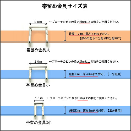 商品説明素材真ちゅう、ロジウムメッキ、ゴールドメッキ、ブラックニッケルメッキサイズ 約14mm×10mm (帯を通す輪14mm、ピンを通すパイプ10mm)使用方法・注意お使いのブローチを簡単に帯留めにできます! ※ご使用頂く場合は帯幅が13mm以下の物をご使用下さい、またブローチはピン(針)の長さが11mm以上のものをご使用下さい。